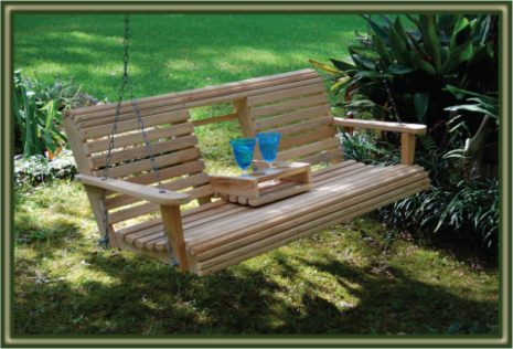 Cypress Moon creates beautiful, unfinished wooden furniture that is designed for strength and weather tolerance. Handmade from Louisiana Cypress trees, these Rollback Wooden Porch Swings have a flip-down console in the middle to place your drinks on! Cypress Moon swings are heavily constructed with slats that are 1 inch thick and 1 3/4 inches wide routered (no sharp edges). Each slat is finish sanded on all sides and ends for your safety and comfort . In addition, these swings have 4 supports across the back AND 4 across the bottom. Few porch swings are built with this kind of quality support system! Each purchase includes all necessary hardware for a standard porch installation: S-hooks, chains, bolts, and eyebolts. As with all Cypress Moon Furniture, price includes FREE SHIPPING!- Made in America!