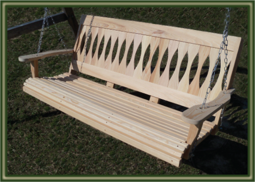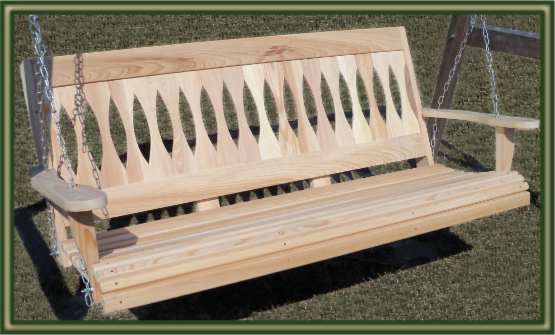 Cypress Moon creates beautiful, unfinished wooden furniture that is designed for strength and weather tolerance. Handmade from Louisiana Cypress trees, our Decorative Porch Swing, The Hourglass, is naturally beautiful and will accent any front porch! Cypress Moon swings are heavily constructed with slats that are 1 inch thick and 1 3/4 inches wide routered (no sharp edges). Each slat is finish sanded on all sides and ends for your safety and comfort . In addition, these swings have 4 supports across the back AND 4 across the bottom. Few porch swings are built with this kind of quality support system! Each purchase includes all necessary hardware for a standard porch installation: S-hooks, chains, bolts, and eyebolts. As with all Cypress Moon Furniture, price includes FREE SHIPPING!