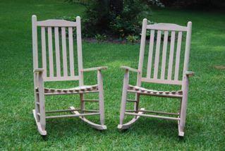 Beautiful SET of Oak Rocking Chairs! Each rocker is a full 43" tall and is handcrafted from solid oak by our family friends here in the USA. The design features a perfect pitch (the angle of the seat to the ground when empty and at rest), and a double scooped contoured seat. Construction uses NO GLUE or harsh chemicals. Instead, the tried and true Swelled Joint technique keeps everything in place, and the joints actually get tighter with time. The notched dowels make them nearly impossible to remove. Experience these fabulous rockers for yourself- no shortcuts are taken in the craftsmanship of these chairs. Simple assembly required. You only put the rockers on, then start rocking.